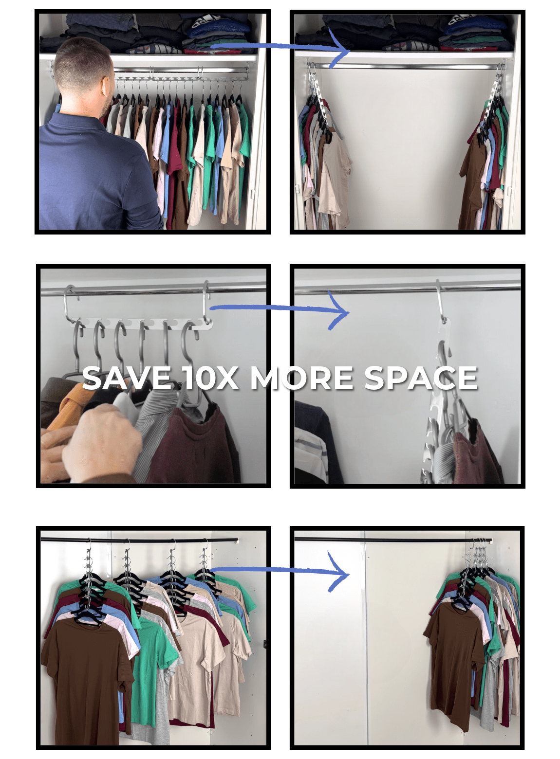 This innovative hanging system allows you to hang up to 12 garments in the space of just 1 hanger. Create immediate space for more clothing or better organization.